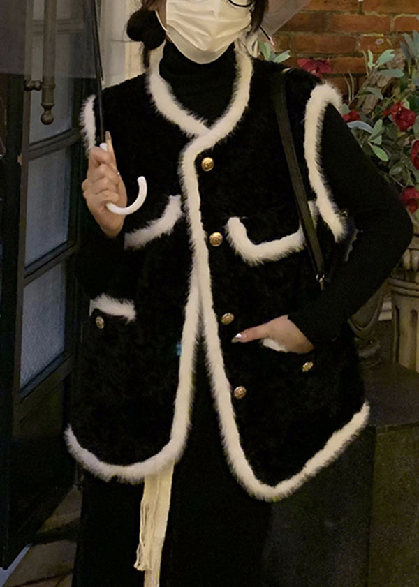 Fitted Black O-Neck Pockets Patchwork Faux Fur Vest Sleeveless WN022