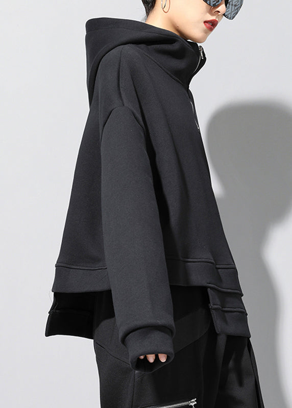 Fitted Black Stand Collar Patchwork Pockets Warm Fleece Hooded Sweatshirt Winter RZ006