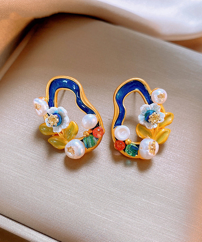 Floral Pearl Blackish Stylish Stud Earrings Overgild Copper Green