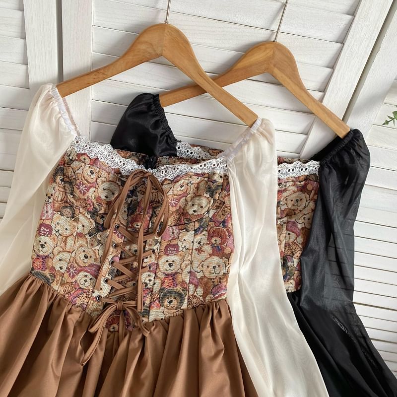 Long-Sleeve Square Neck Bear Patterned Lace Up Panel Mini A-Line Dress