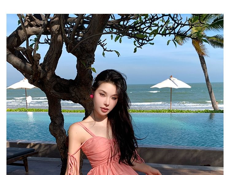 Spaghetti Strap V-Neck Plain Ruffle Trim Maxi A-Line Dress