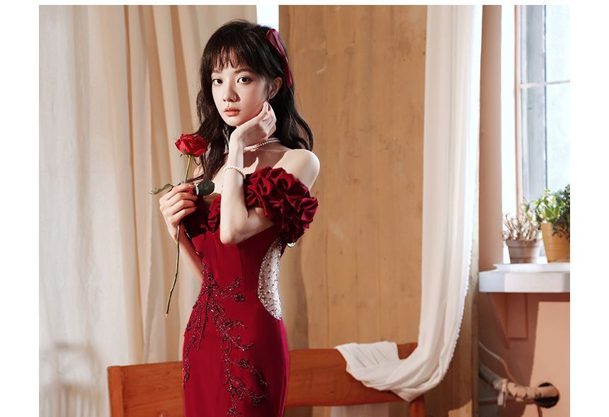 Short-Sleeve Off Shoulder Plain Beaded Ruched Panel Mesh Mermaid Evening Gown