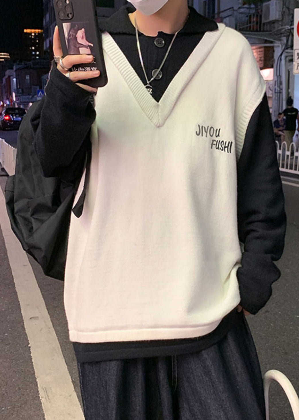 Patchwork Cozy Spring Embroideried Art Sweater Men Beige Knit