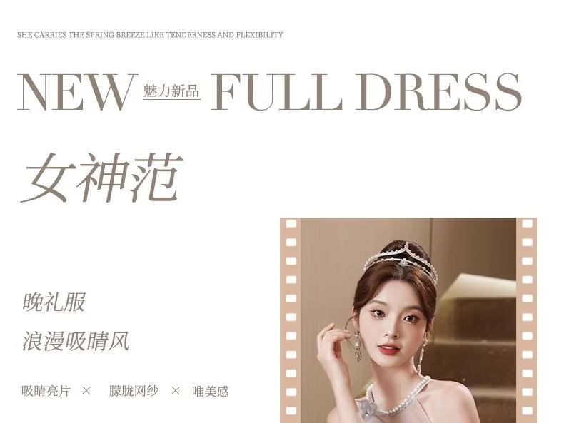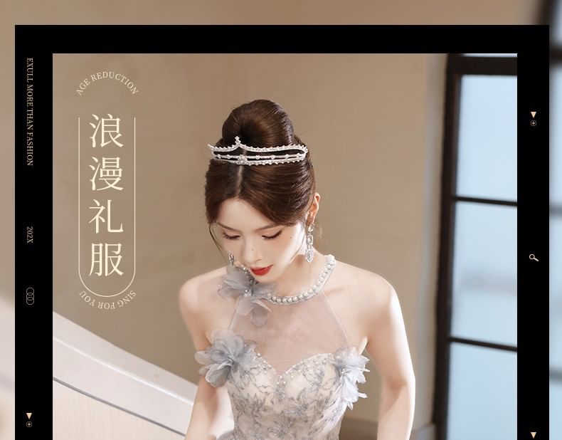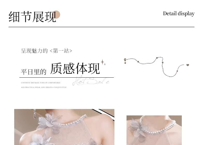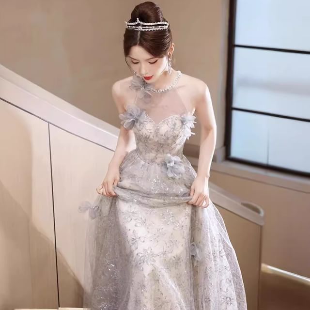 Sleeveless Round Neck Floral Patterned Faux Pearl Mesh A-Line Evening Gown
