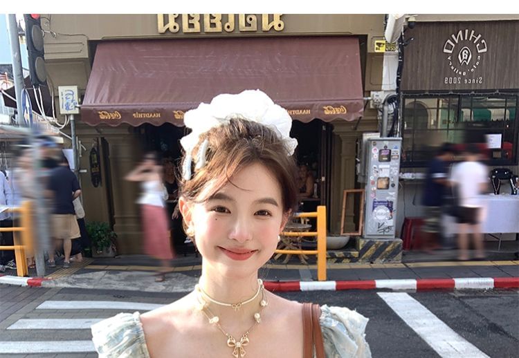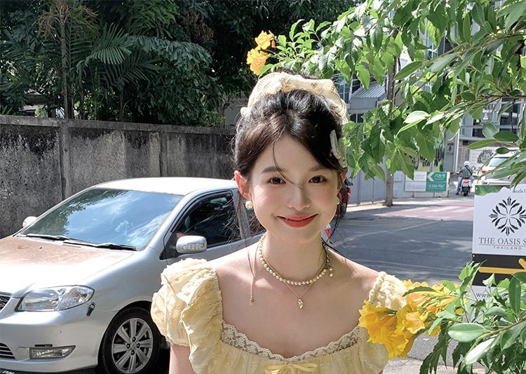 Sleeve Bow Neck Lace Short Panel Square Ruffle A-Line Dress Mini