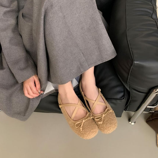 Cross Strap Plain Bow Accent Fleece Mary Jane Flats