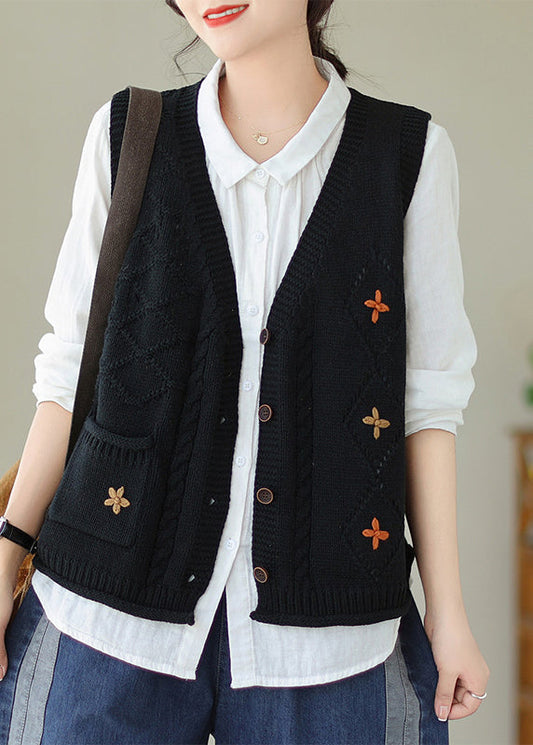Black Pockets Knit Vest V Neck Button Sleeveless QA032