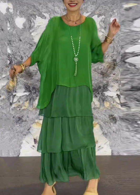 Green Print False Two Pieces Dresses O Neck Bracelet Sleeve QA021