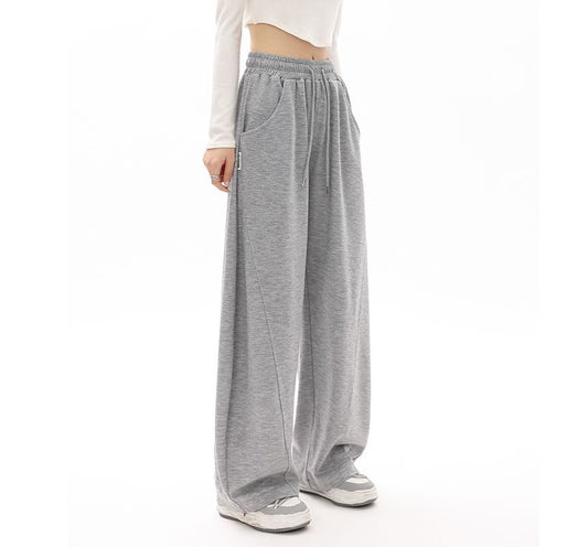 High Waist Plain Pocketed Drawstring Wide Leg Sweatpants