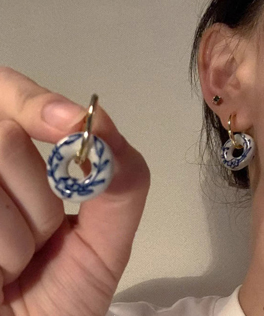 Vintage Gold Copper Overgild Ceramics Floral Hoop Earrings QU047