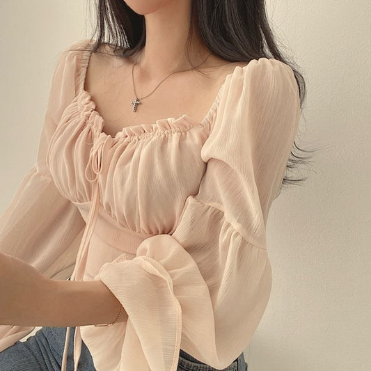 Cinched Sleeve Square Neck Plain Ruched Tie Front Blouse