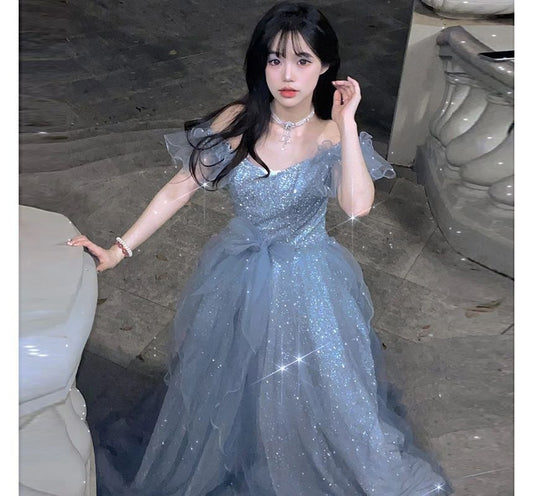 Short-Sleeve Off Shoulder Gradient Sequin Panel Mesh Mermaid Evening Gown