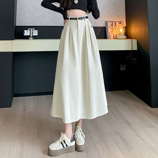 High Waist Plain Pleated Midi A-Line Denim Skirt