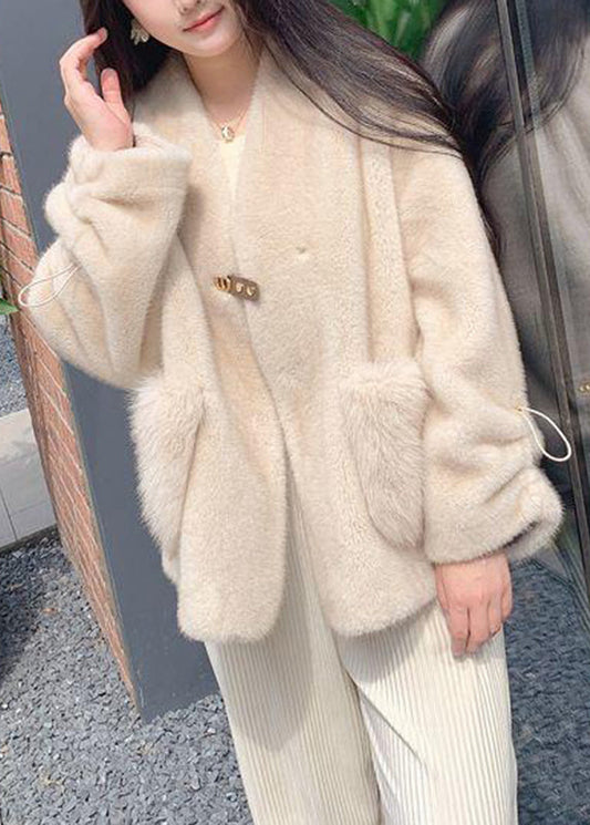 Casual Beige V Neck Button Mink Hair Leather And Fur Long Coats Winter WV022
