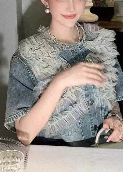 Short Blue Light Yoga Chic Sleeve Tulle Patchwork Top