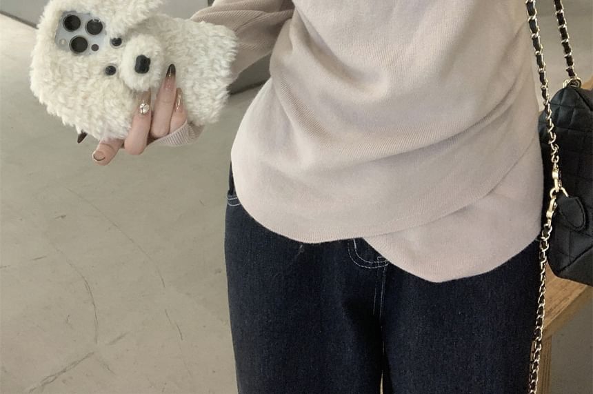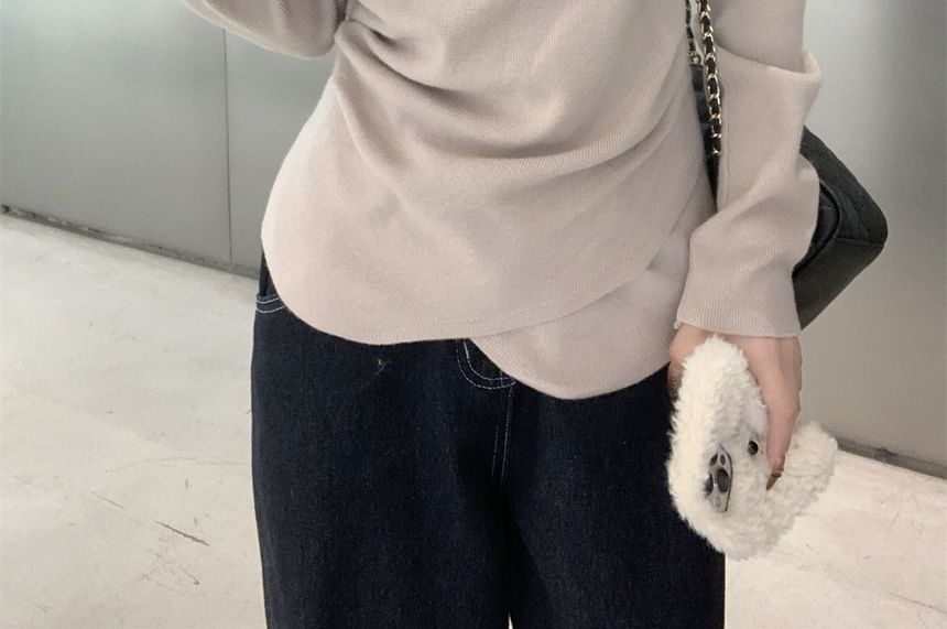Long-Sleeve V-Neck Plain Asymmetrical Floral Accent Slim Fit Knit Top