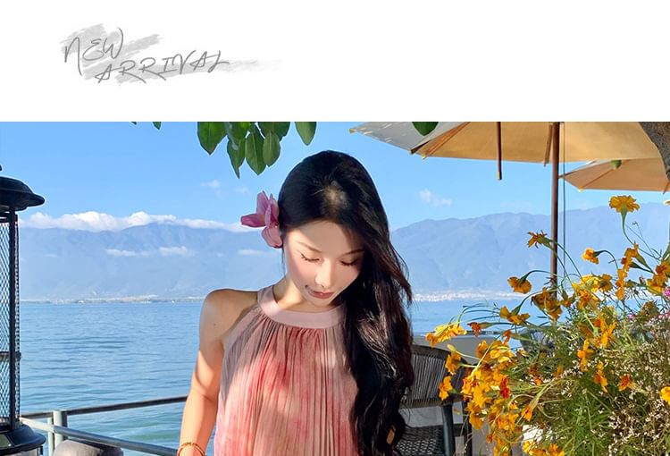 Sleeveless Crew Neck Pleated Tie Dye Maxi A-Line Dress
