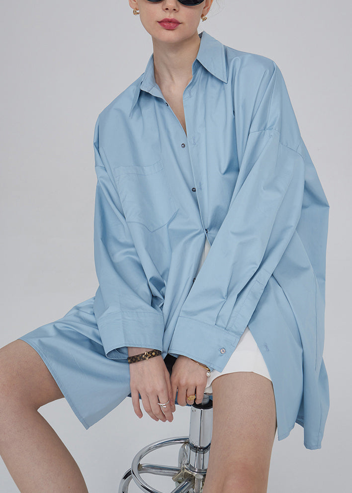 Plus Size Blue Button Pockets Patchwork Cotton Blouses Fall TU015