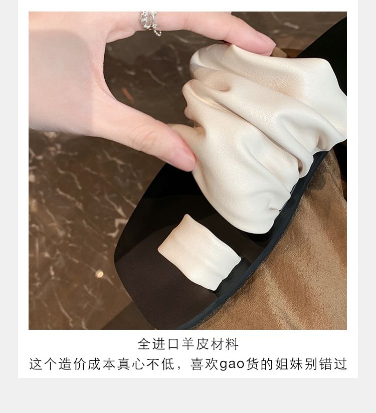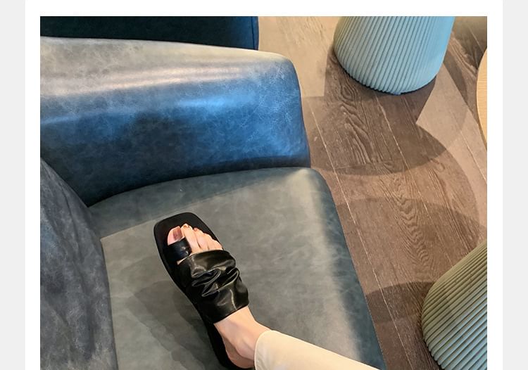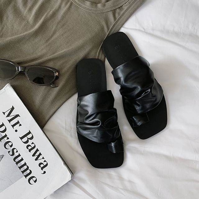 Square Toe Ruched Faux Leather Toe Loop Slide Sandals