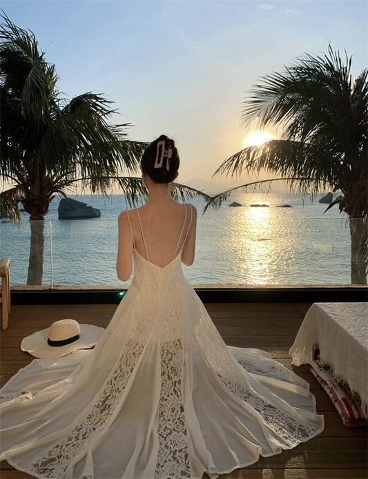 Lace Panel Spaghetti Back Maxi Plain Strap Sundress Open