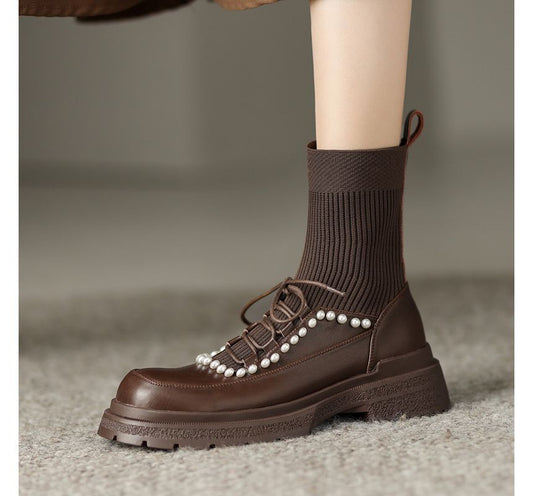 Platform Block Heel Faux Pearl Chain Lace Up Short Boots