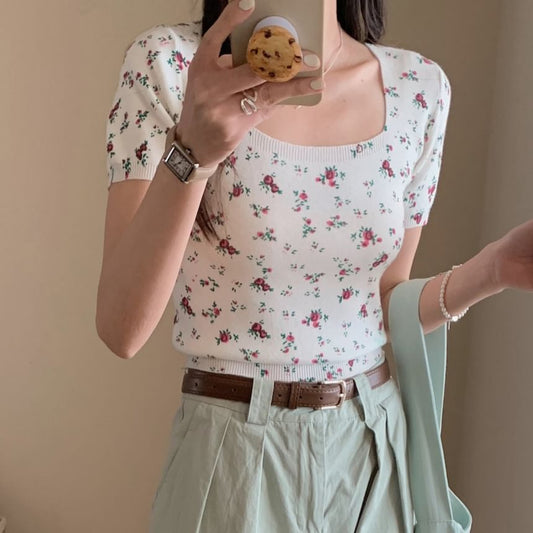 Short-Sleeve Square Neck Plain Bow Back Knit Top