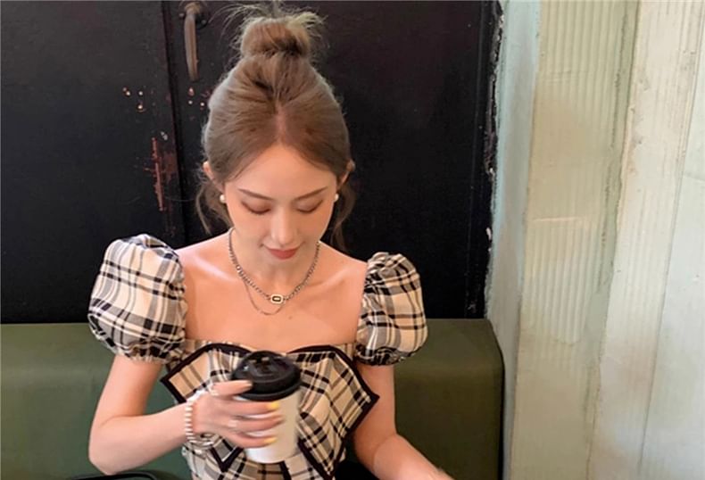Puff Sleeve Square Neck Plaid Bow Blouse