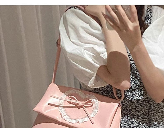 Bow Lace Trim Faux Leather Flap Crossbody Bag