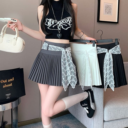 Bow Skirt Trim Pleated Low Waist A-Line Lace Mini Pinstriped