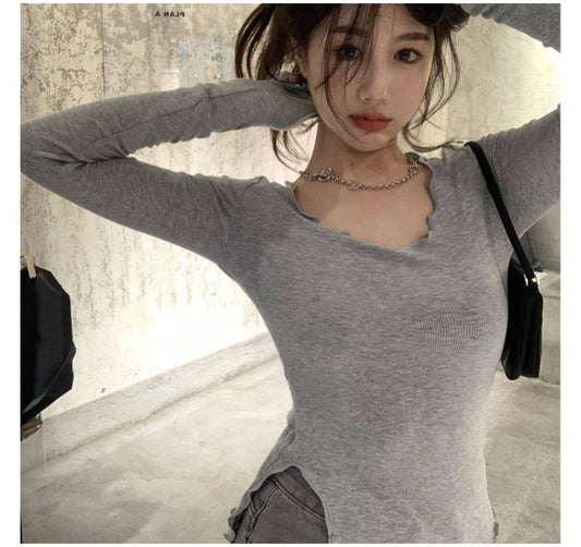 Slit Edge Long-Sleeve Neck Plain T-Shirt Scoop Lettuce