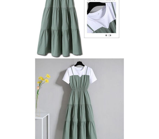 Short-Sleeve Crew Mock Two-Piece A-Line Dress Neck Tiered Midi