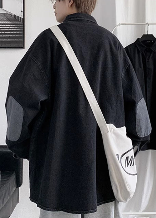 Black Button Loose Denim Men Shirts Peter Pan Collar Spring