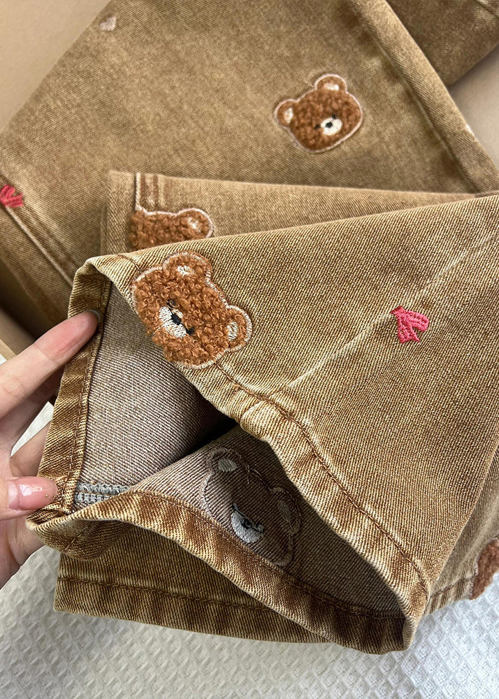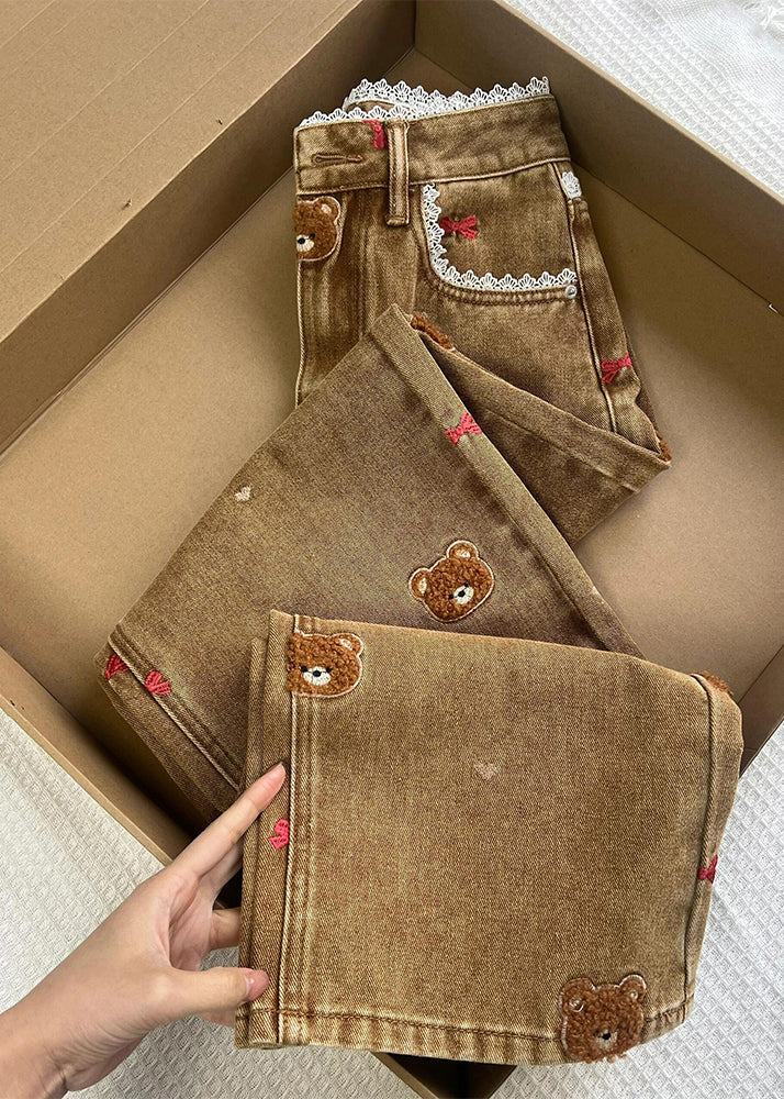 Fashion Coffee Embroidered Lace Patchwork Denim Straight Pants Spring TN023