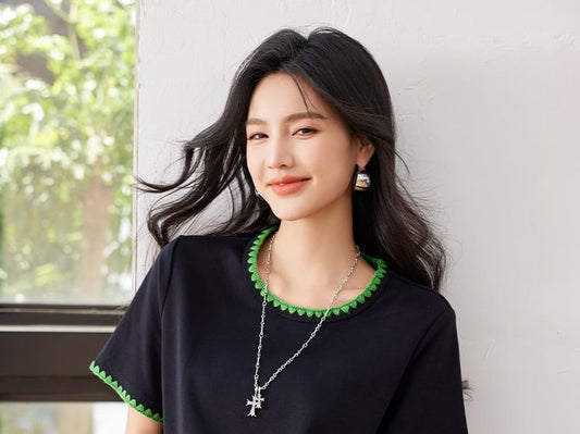 Lettuce Edge Trim Round Neck Short Sleeve T