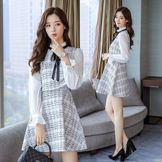 Long Sleeve Round Neck Plaid Mock Two Piece A-Line Midi Dress