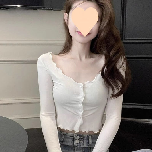 Long Sleeve Scoop Neck Plain Lettuce Edge Button Crop Top
