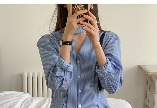 Long Sleeve V-Neck Striped Tie Front Blouse