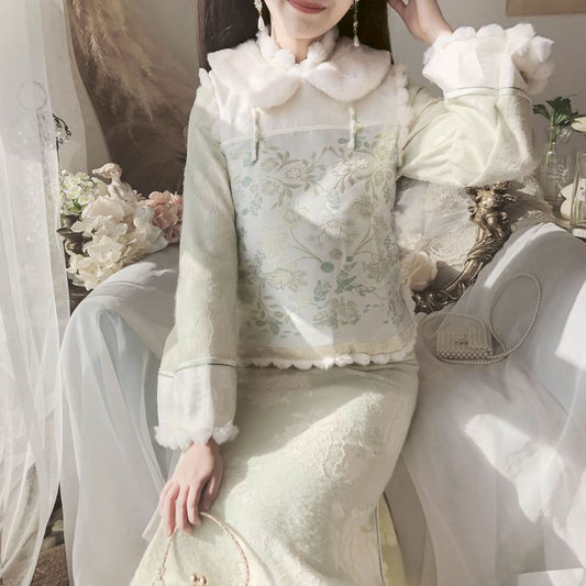 Qipao mi-long fleuri à manches longues et col / Gilet brodé / Ensemble