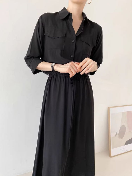 Long-Sleeve Collared Plain Drawstring Waist Maxi A-Line Shirt Dress