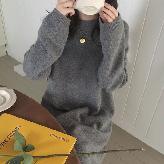 Long-Sleeve Crew Neck Plain Midi Shift Sweater Dress