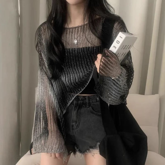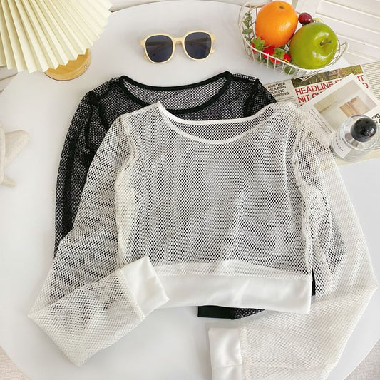 Long-Sleeve Crewneck Perforated Plain Top
