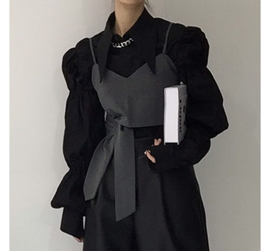 Long-Sleeve Plain Blouse / Irregular Cropped Camisole Top