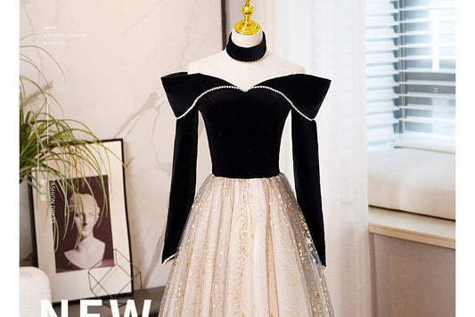 Long-Sleeve Off-Shoulder Two Tone Sequin A-Line Evening Gown