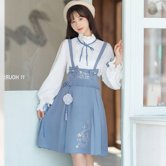 Long-Sleeve Pintuck Ribbon Lace Trim Blouse / High Waist Print Bow A-Line Jumper Skirt / Set