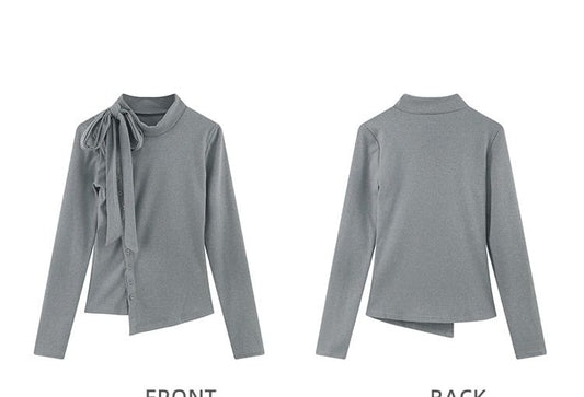 Long-Sleeve Plain Asymmetrical Stand Button-Up T-Shirt Collar
