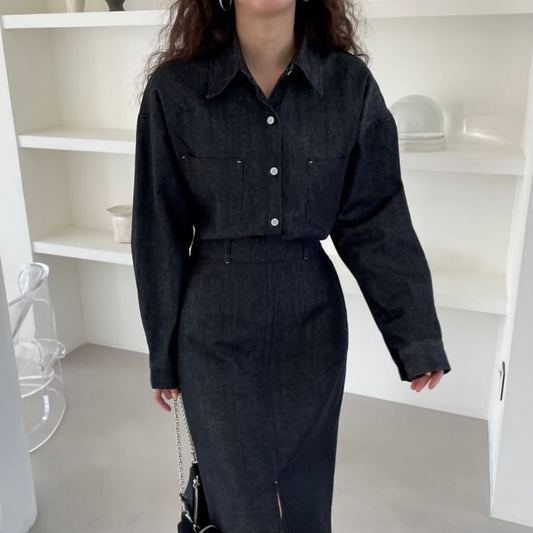 Collared Drop Shoulder Denim Shirt / High Waist Plain Midi A-Line Skirt