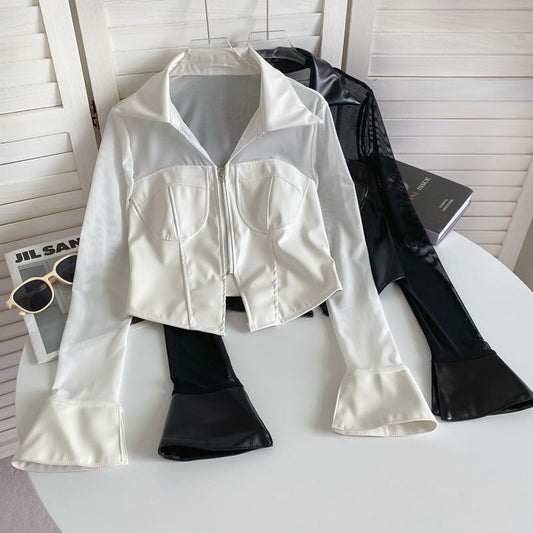 Collared Fluffy Panel Faux Leather Zip Jacket