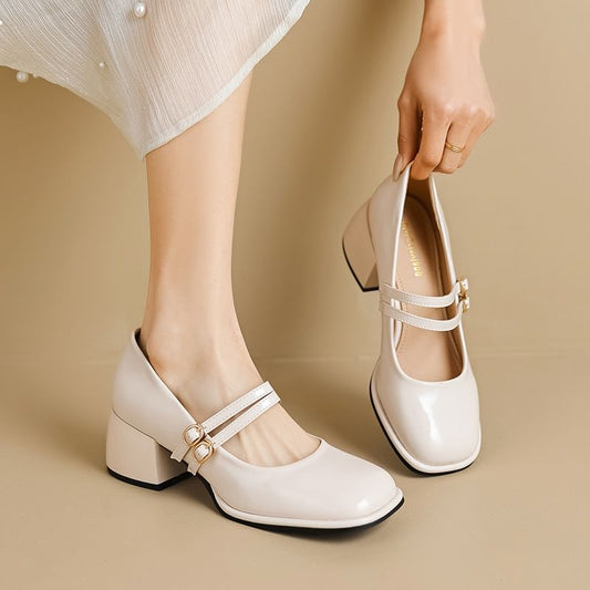 Double-Strap Square Jane Pumps Toe Chunky Heel Mary