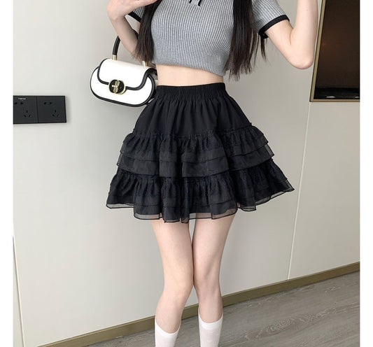 Balletcore High Rise Plain Tiered Tie Side Panel Lace Mini A-Line Skirt