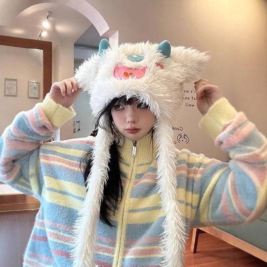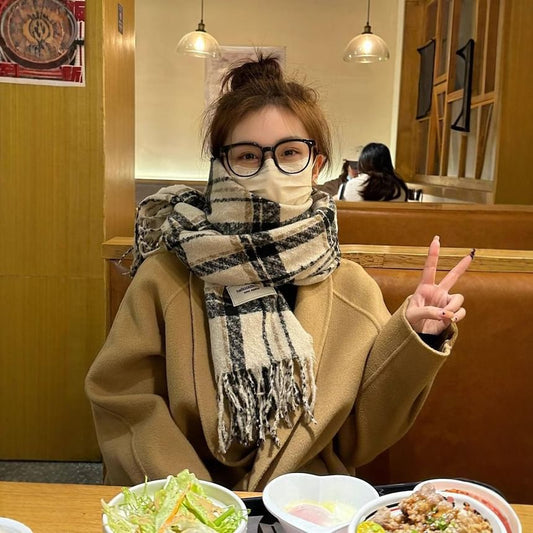 Long Sleeve Tie Neck Plain Pom Pom Top / Plaid Maxi A-Line Dungaree Dress